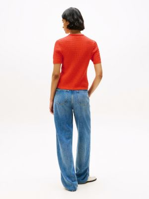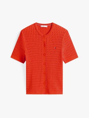 This short-sleeved cardigan with an intricate, fine gauge cable knit is a fresh take on a classic design, offering day-to-evening style.
