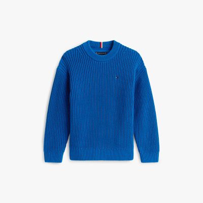 This cosy crew-neck jumper is knitted with a thick half-cardigan stitch, giving it a distinctive texture and a snug feel.