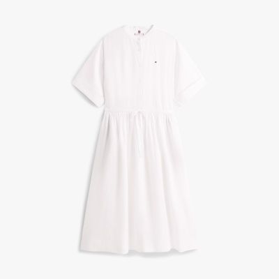A gathered waist, box pleat on the back and turned-back cuffs help this yarn-dyed linen shirt dress cinch and flatter your figure.
