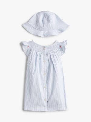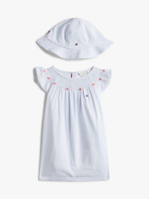 Presented in a gift box, this set comprises a dress, a pair of bloomers and a bucket-style hat for a coordinated look.
