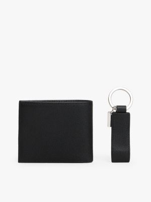 This smart set includes a slimline card holder with multiple slots and a matching key fob, both crafted from textured leather.
