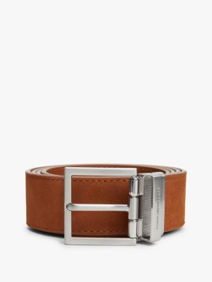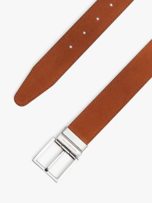 This leather belt with a square buckle offers both a smart, smooth finish and a more laid-back textured side for versatile styling.