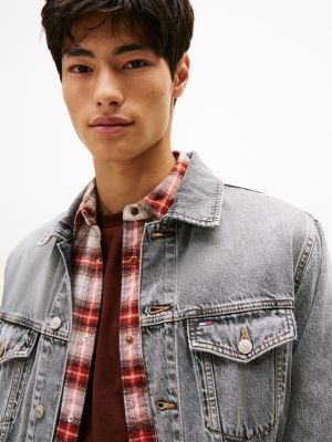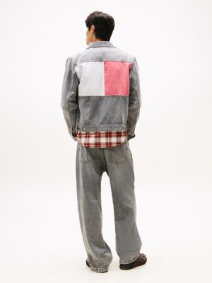 This authentic rigid denim trucker jacket showcases a signature palette with a bold colour-blocked design on the back.