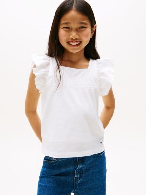 This knitted top features ruffled sleeves and a textured design, making it a playful pick for warmer days.