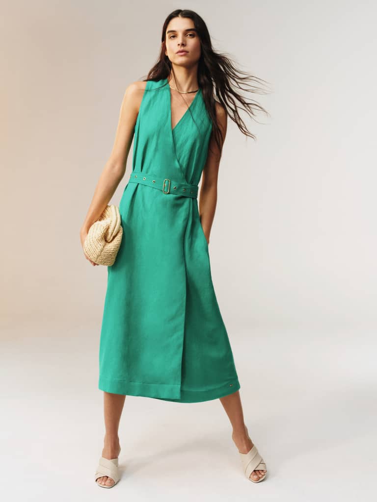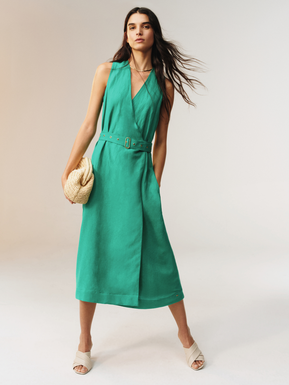 Belted Linen Blend Sleeveless Wrap Midi Dress